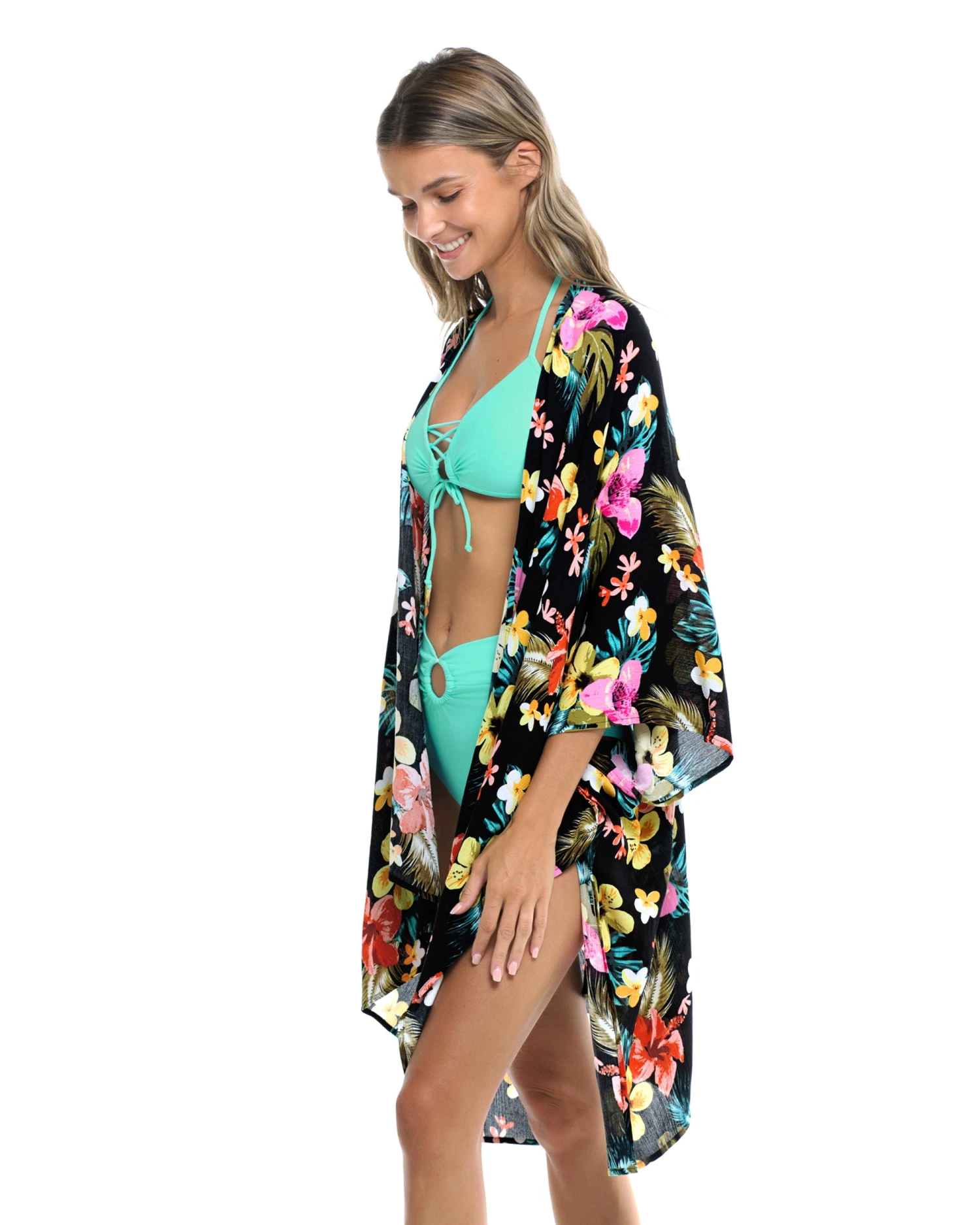 With Aubree, our kimono-style beach cover-up, you can shield yourself from the sun without having to hide your fabulous figure thanks to its open-front design. This elegant piece works double-duty as a beach cover-up that can also be dressed up for dinner at the resort.
