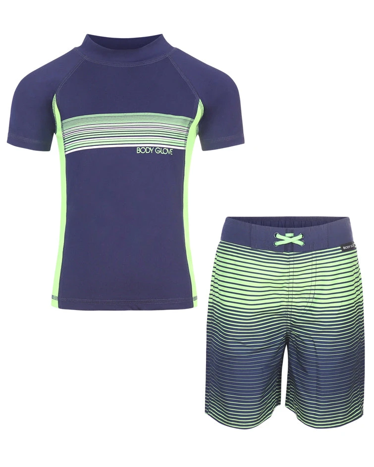 Your little guy will be ready for a day in the water in this coordinating rash guard and swim shorts set.