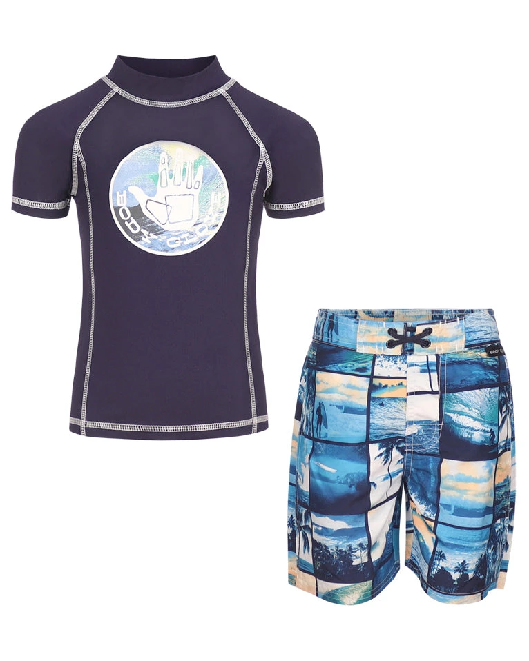 Your little guy will be ready for a day in the water in this coordinating rash guard and swim shorts set.