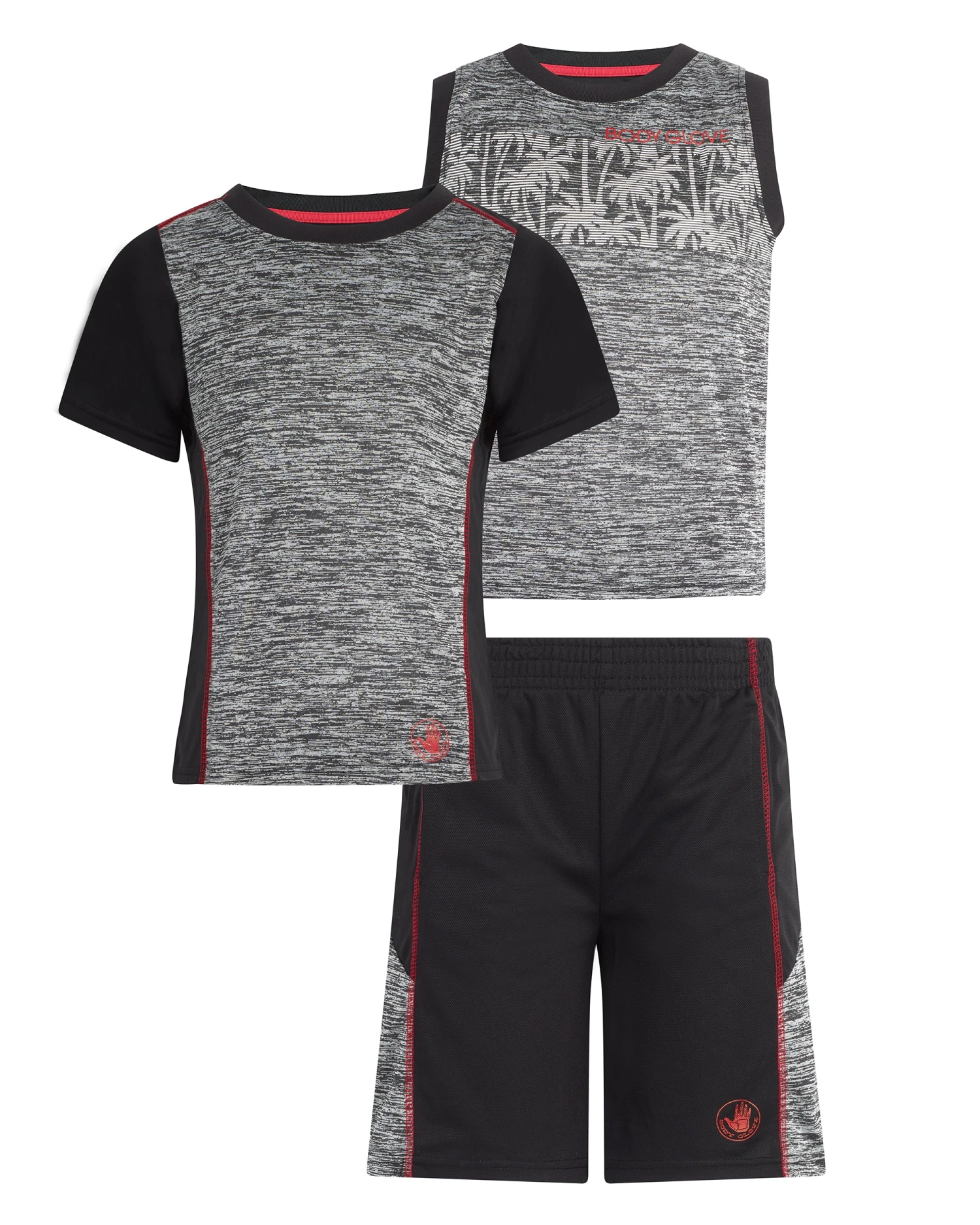 - Set includes: short-sleeve shirt, sleeveless tank, and shorts
