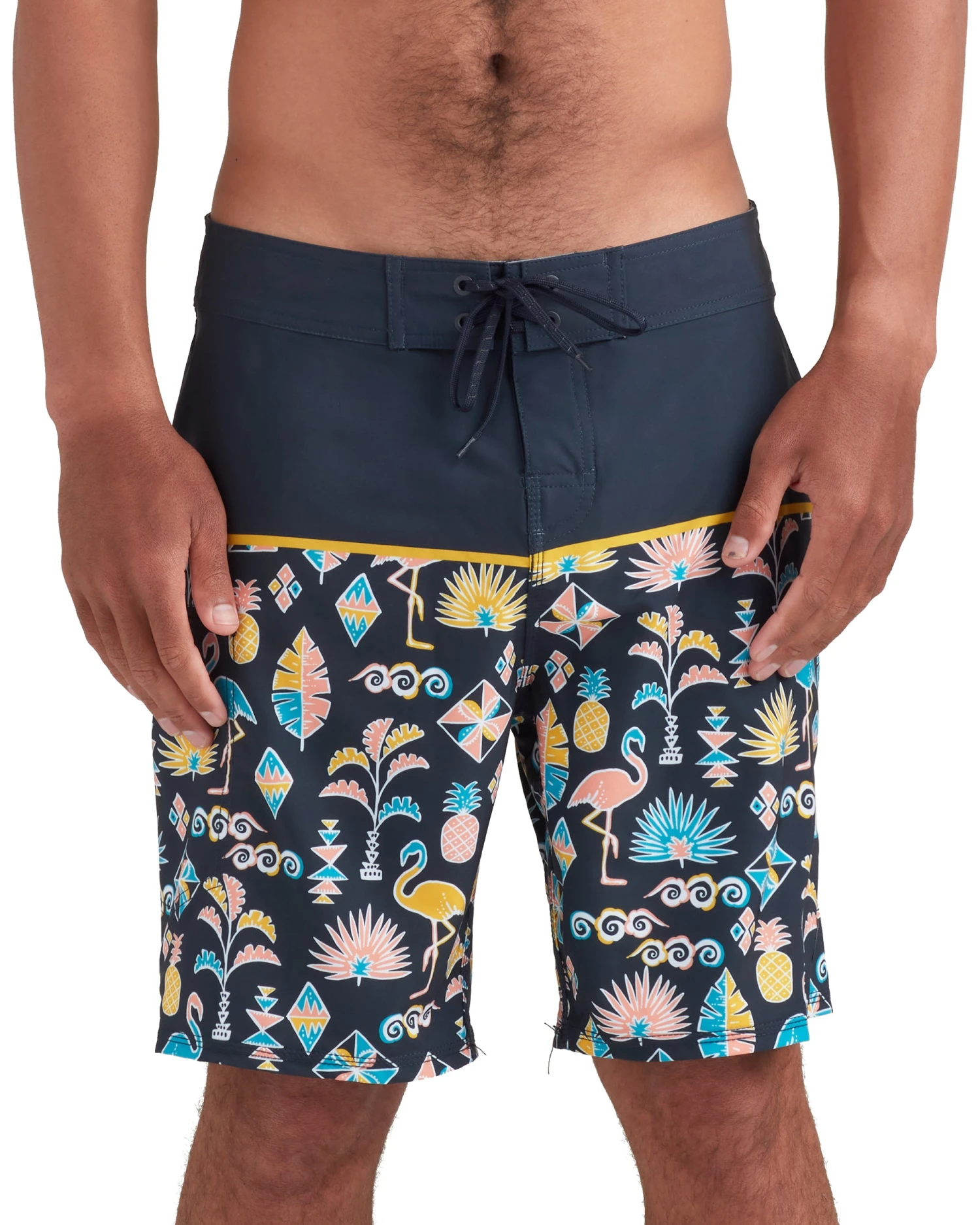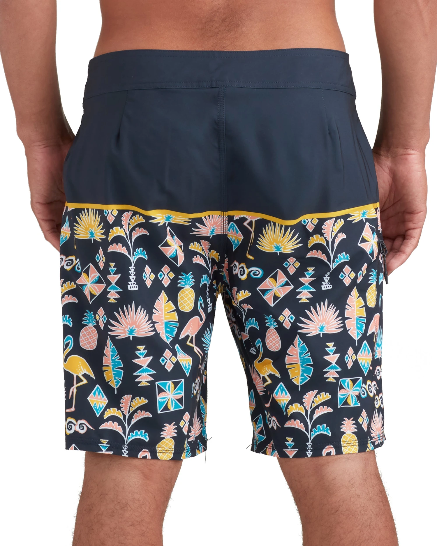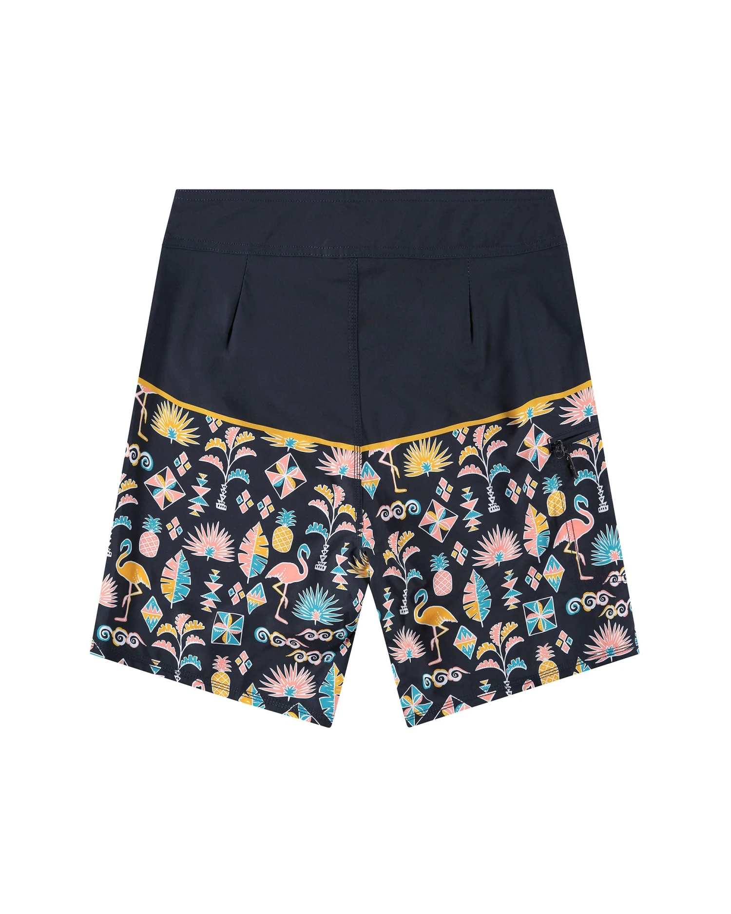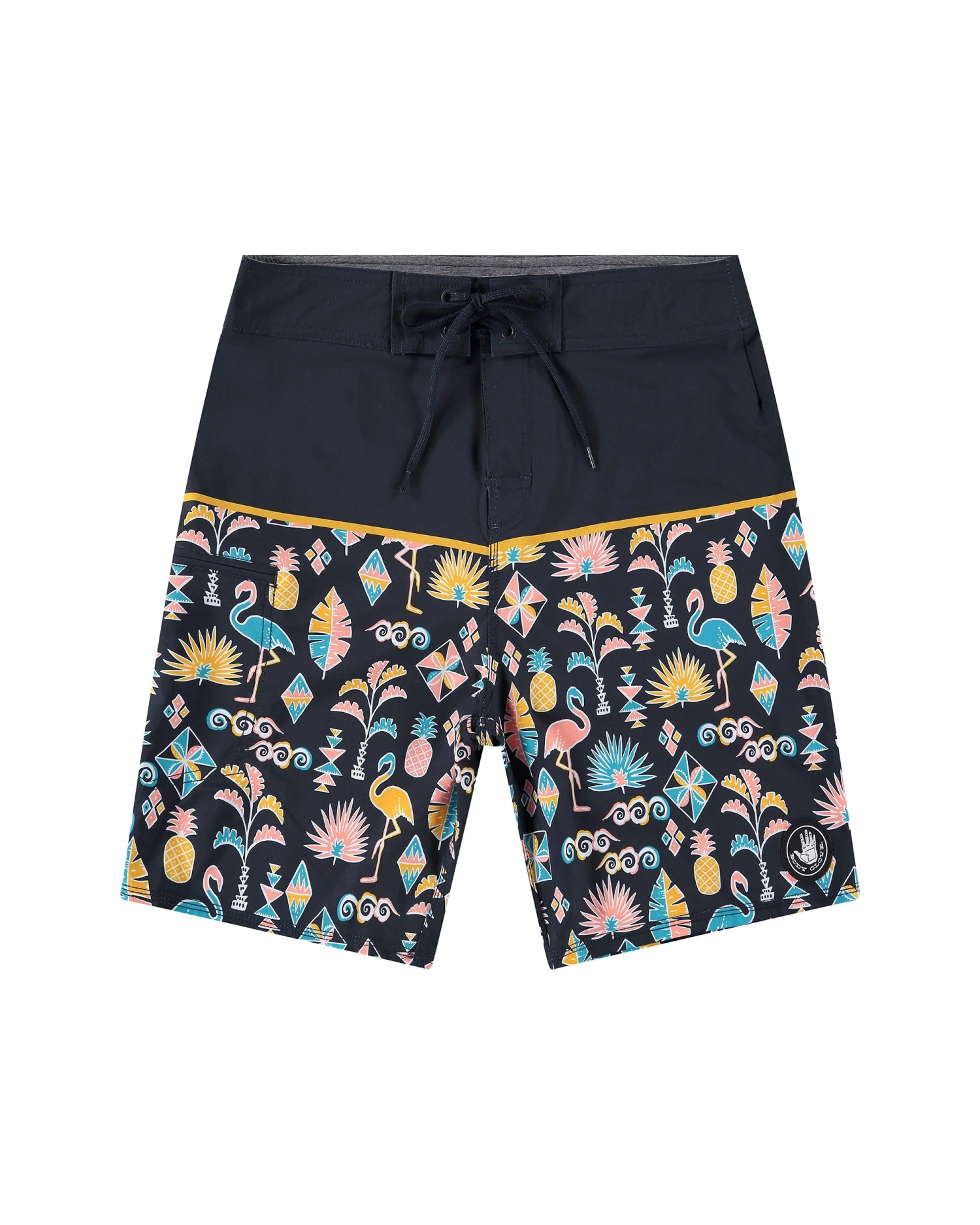Primed and ready to rock the peak swell party, the Dingos 20” Boardshort is built of a super-soft, 4-way stretch fabric that features a dazzling tropical hieroglyph print below a solid color block. Complete with a side-zip storage pocket and Lycra fly for impeccable comfort, the Mingo Boardshort brings the beach no matter the occasion on land or at sea.