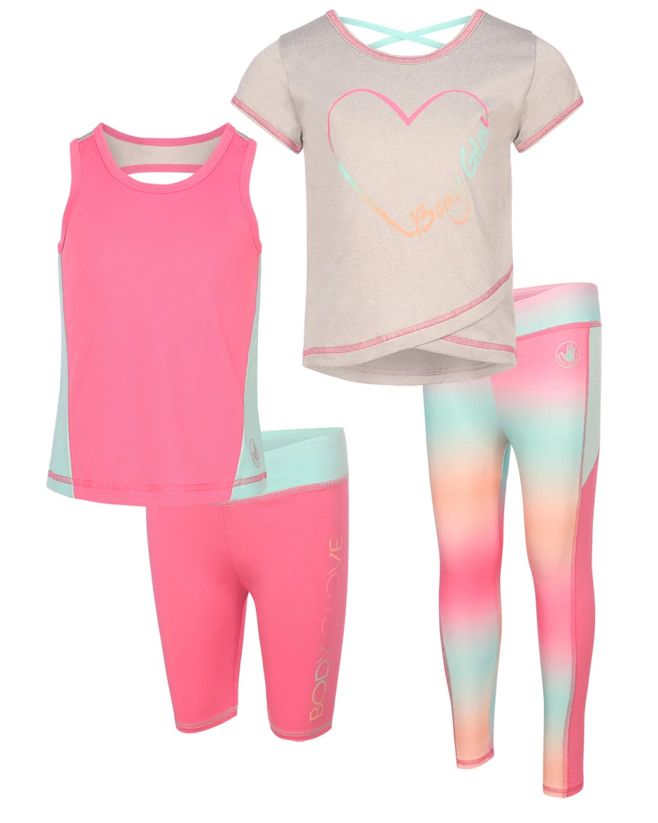 - Set includes: tank, short-sleeve top, shorts, and pants