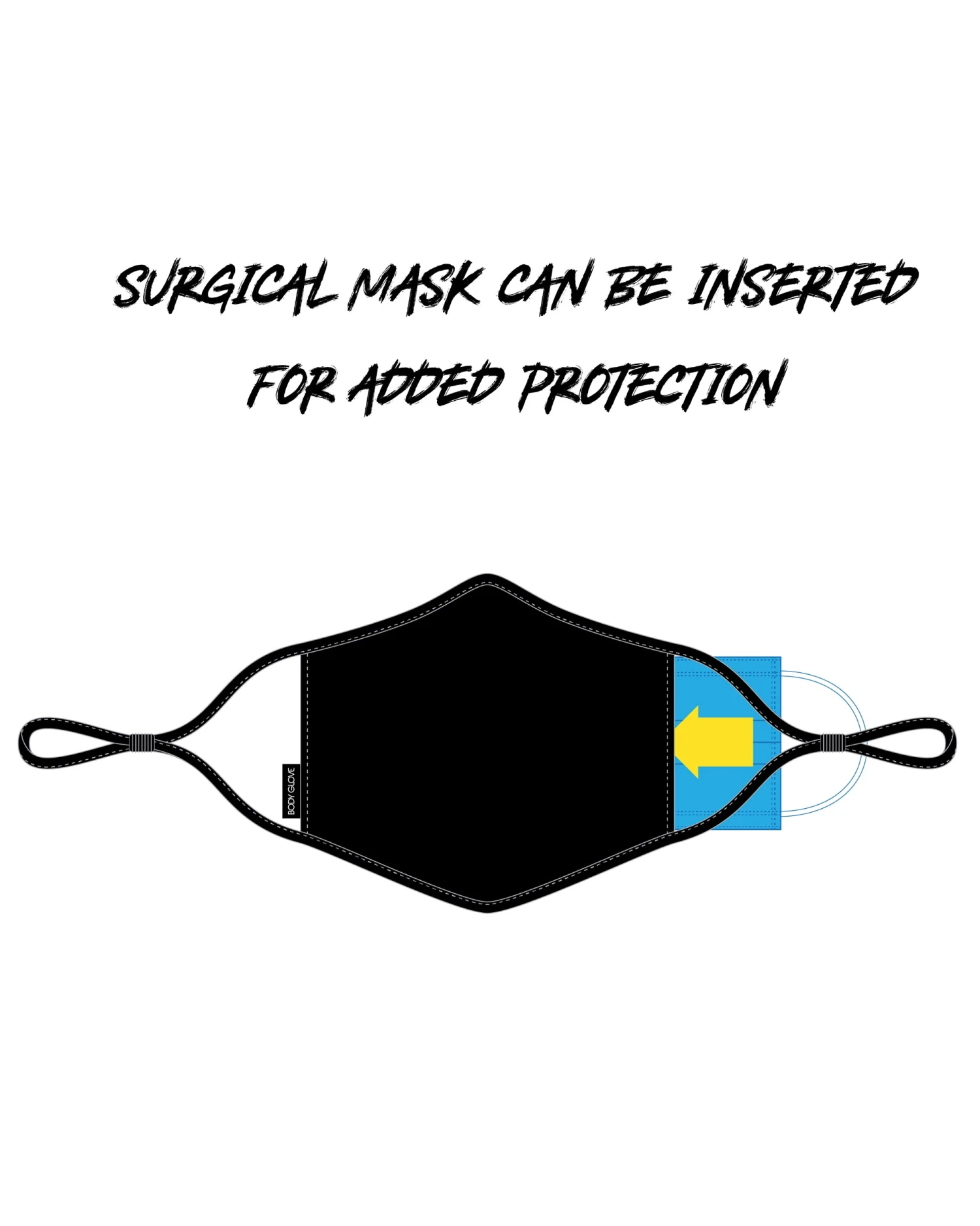 • Mask can be used on its own or with a surgical mask inserted for added protection
