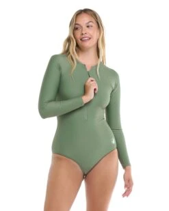 Our Channel paddle suit is a water-friendly bodysuit that can be worn in and out of the water. The sporty cross-over style has raglan long sleeves, a zip-front detail, crew neck, flatlock seams, and medium back coverage. Its UPF 50 fabric protects against the sun’s rays.