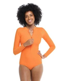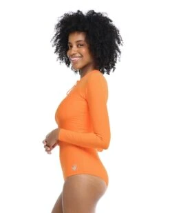 Our Channel paddle suit is a water-friendly bodysuit that can be worn in and out of the water. The sporty cross-over style has raglan long sleeves, a zip-front detail, crew neck, flatlock seams, and medium back coverage. Its UPF 50 fabric protects against the sun’s rays.