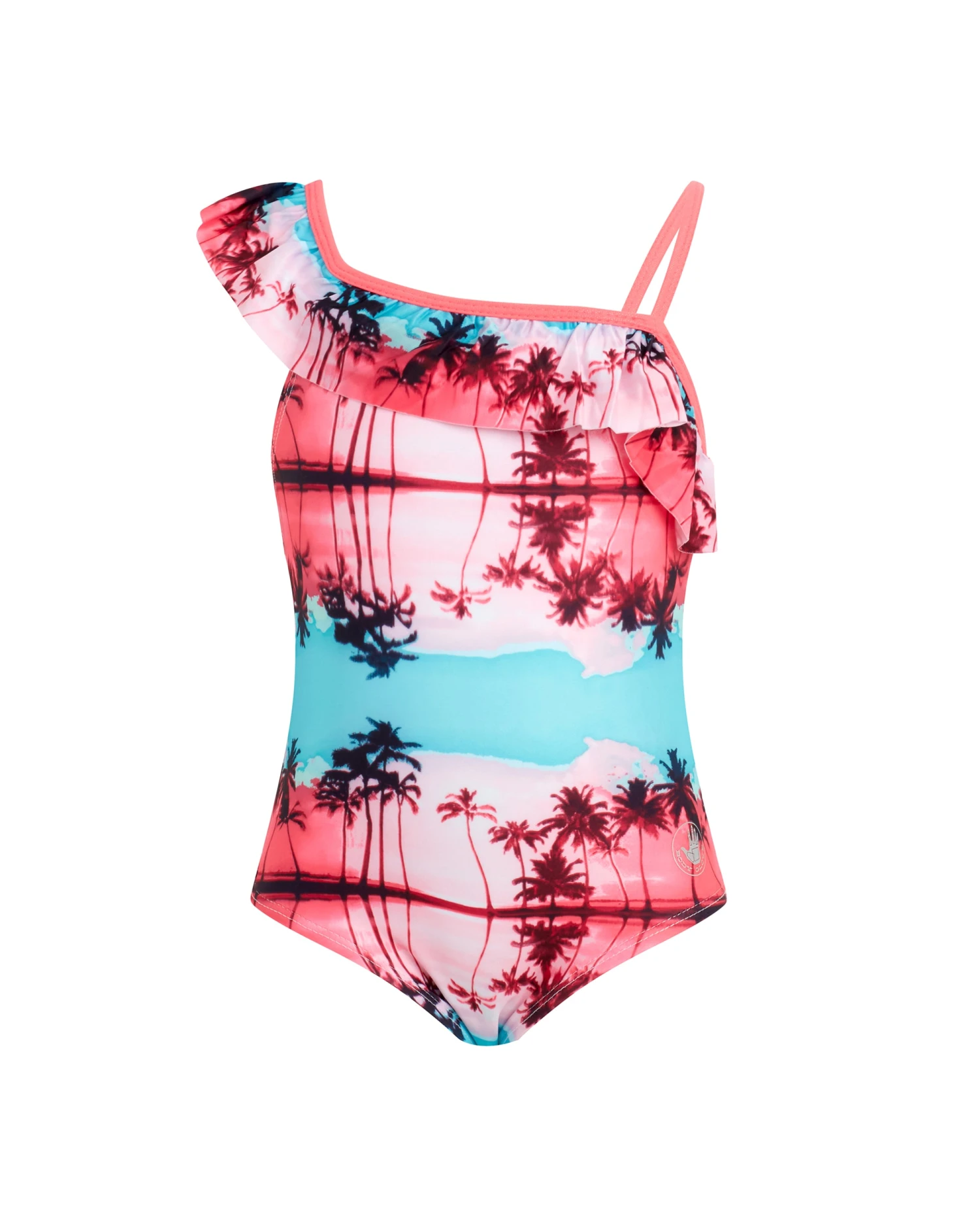 Hit the beach with your little one in style with this pink-and-teal-gradient palm-print one-piece. An asymmetrical ruffle create a fun and festive look.